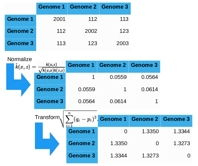 The Gram matrix can be transformed into a distance matrix (diagonal = 0) based on a distance metric