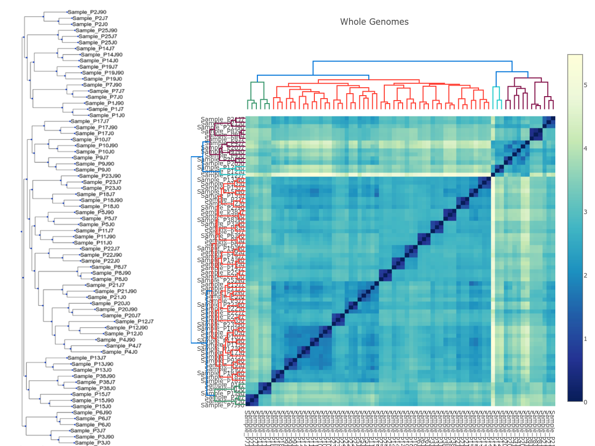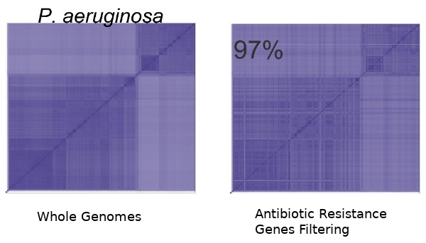 Cophenetic correlation is used to give a similarity score between clusters from whole genomes (all kmers) and filtered genomes (kmers from antibiotic resistance genes).